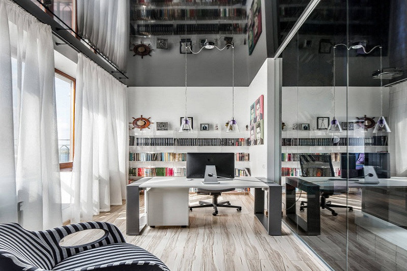 Монтаж натяжного потолка с таким дизайном возможен в комнатах с любой площадью. Это могут быть как небольшие, так и огромные залы.