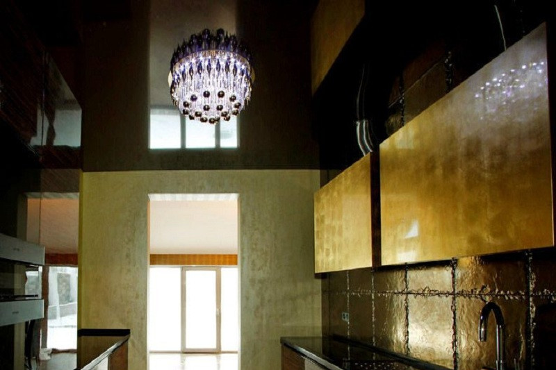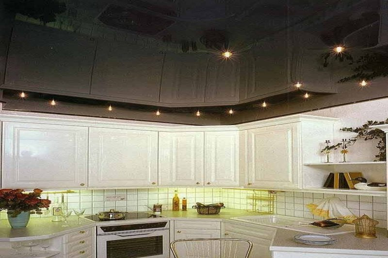 Потолок на кухне позволяет использовать подсветку. При соблюдении всех правил установки, а также норм безопасности, ее эксплуатация окажется неопасной.