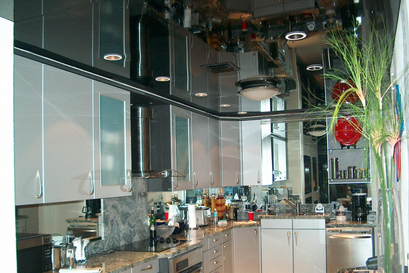 Потолок на кухне может иметь различное оформление. Часто используются однотонные варианты пастельных или темных тонов. Также можно выбрать интересные полотна с фотопечатью.