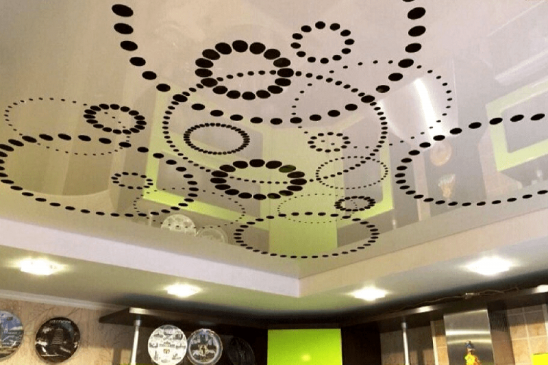 Потолок на кухне может иметь различное оформление. Часто используются однотонные варианты пастельных или темных тонов. Также можно выбрать интересные полотна с фотопечатью.