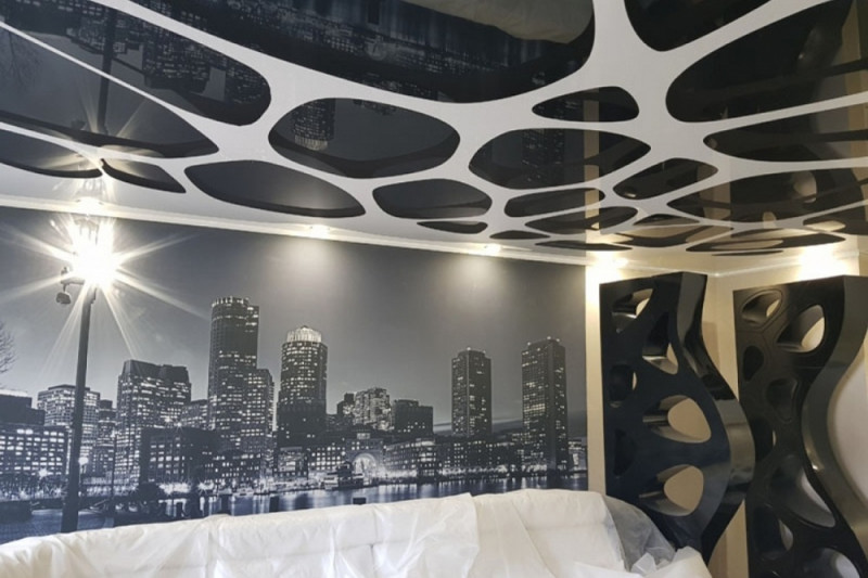 Монтаж натяжного потолка с таким дизайном возможен в комнатах с любой площадью. Это могут быть как небольшие, так и огромные залы.
