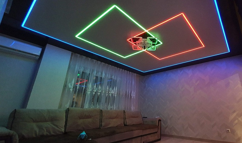 Одним из преимуществ парящего потолка является то, что он изготовлен из высококачественного экологичного материала, который не несет никакого вреда для здоровья. Что касается подсветки, то ее установка проводится с соблюдением всех норм, и как результат – использование осветительных элементов является полностью безопасным.
