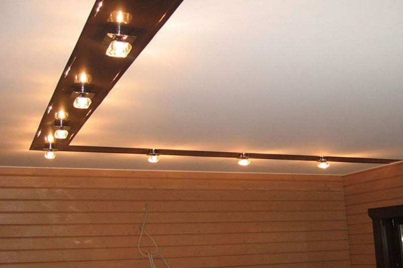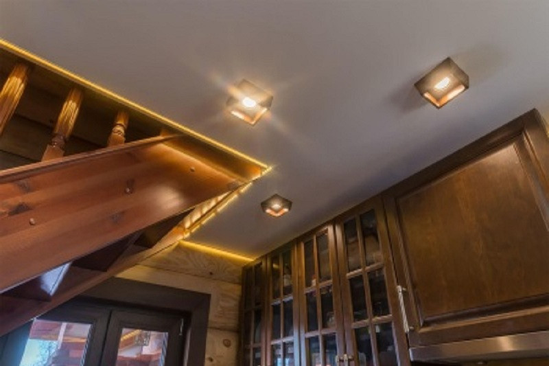 Потолок на кухне позволяет использовать подсветку. При соблюдении всех правил установки, а также норм безопасности, ее эксплуатация окажется неопасной.