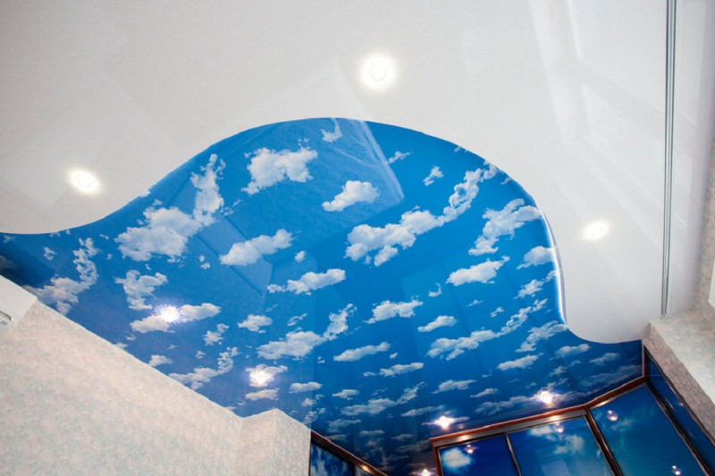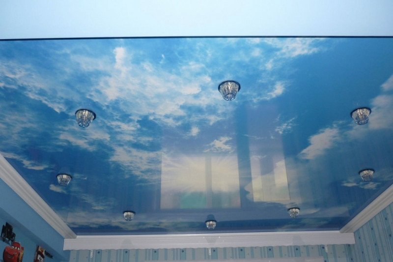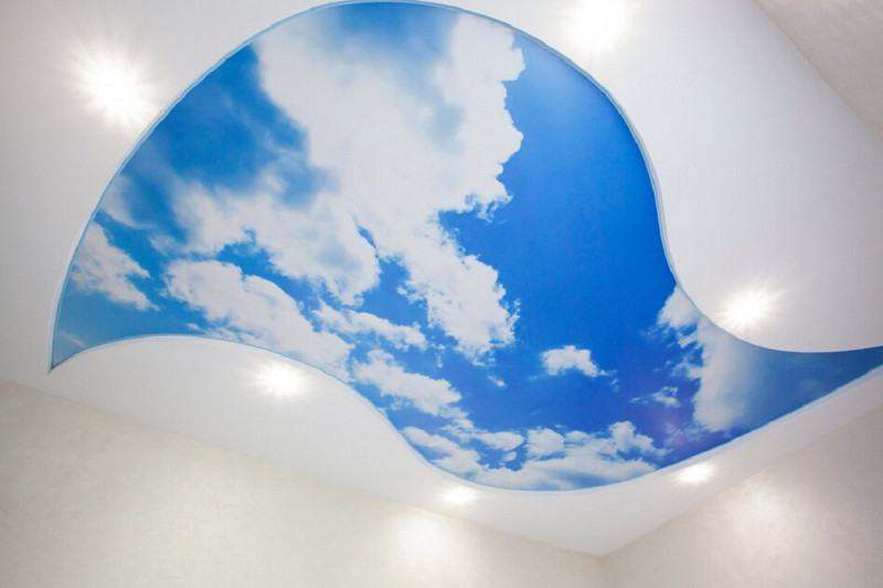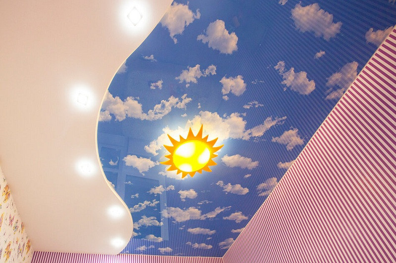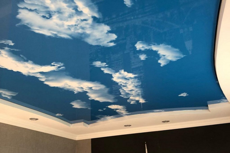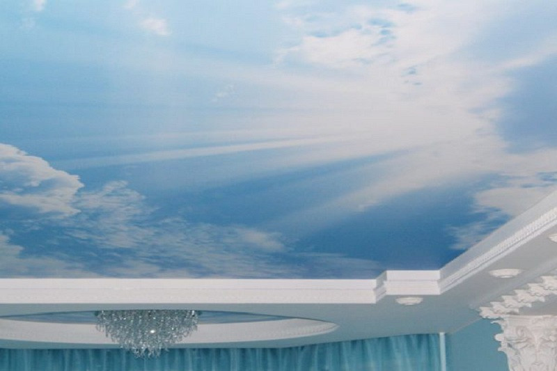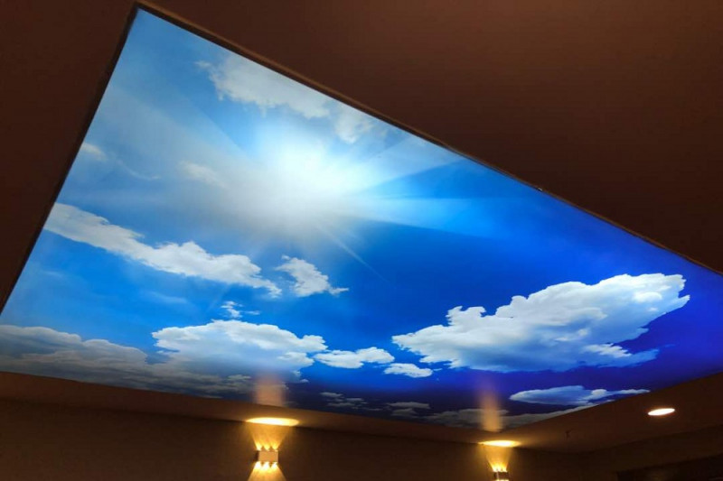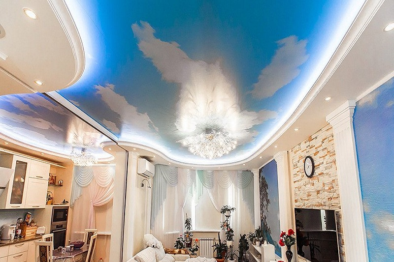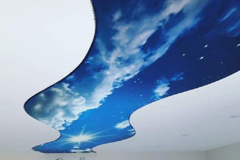 Монтаж натяжного потолка с таким дизайном возможен в комнатах с любой площадью. Это могут быть как небольшие, так и огромные залы.