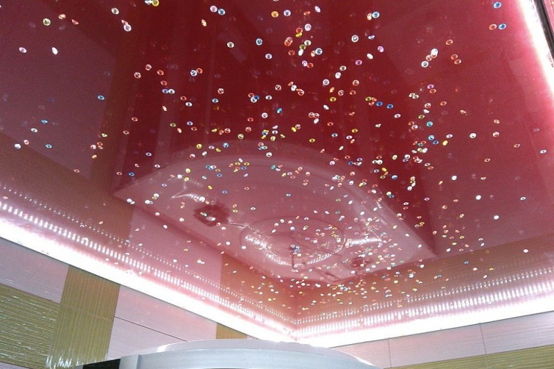 Сейчас используются всевозможные варианты натяжных потолков в ванной. Наиболее популярными являются модели пастельных тонов. Также часто можно встретить потолки в ванной с рисунками в морской тематике. Можно с уверенностью сказать, что никаких ограничений в выборе дизайна сегодня нет.