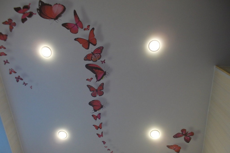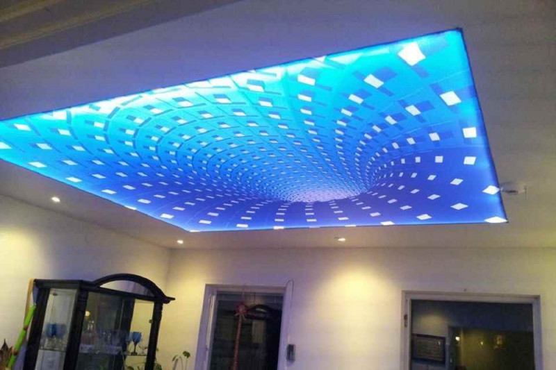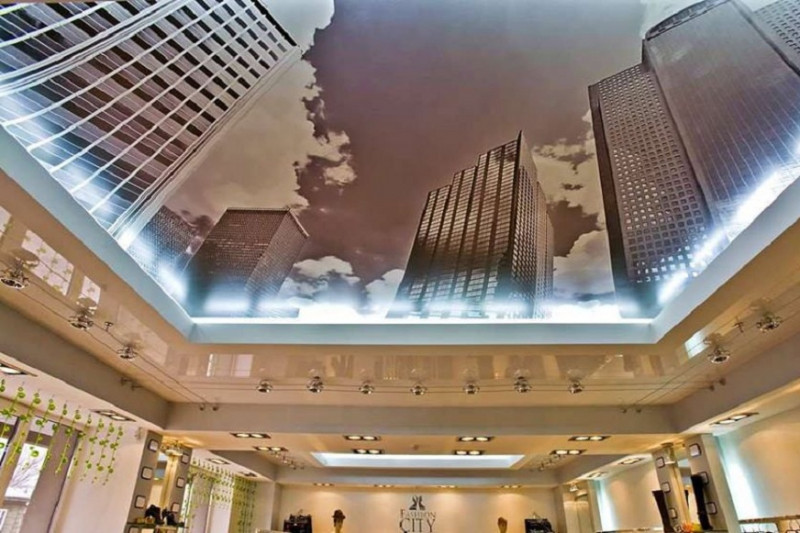 Монтаж натяжного потолка с таким дизайном возможен в комнатах с любой площадью. Это могут быть как небольшие, так и огромные залы.