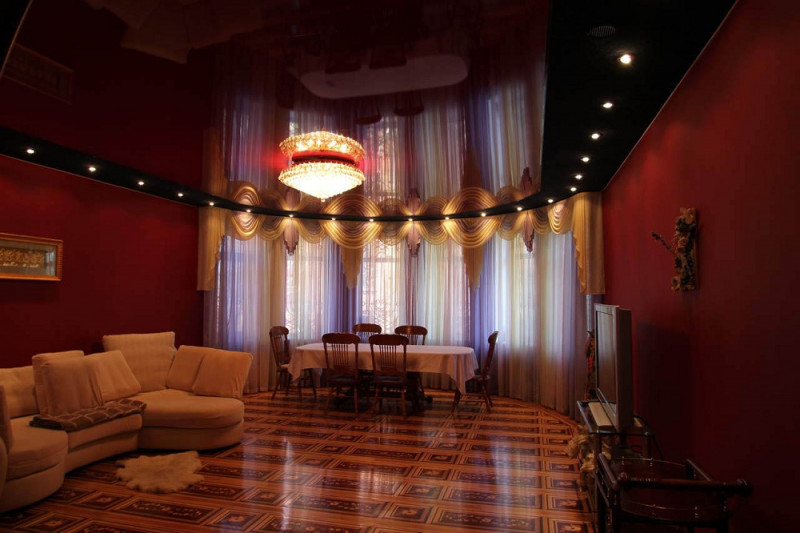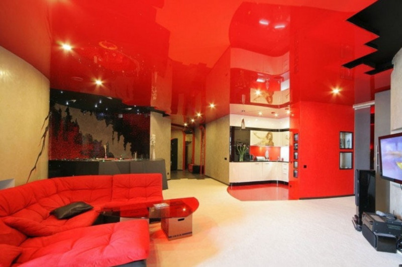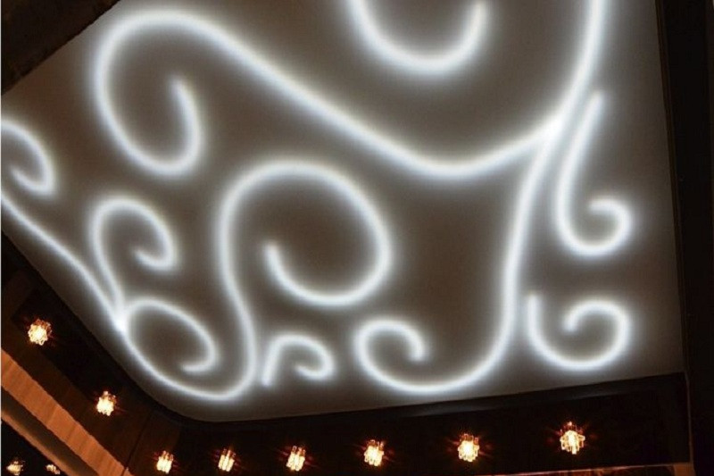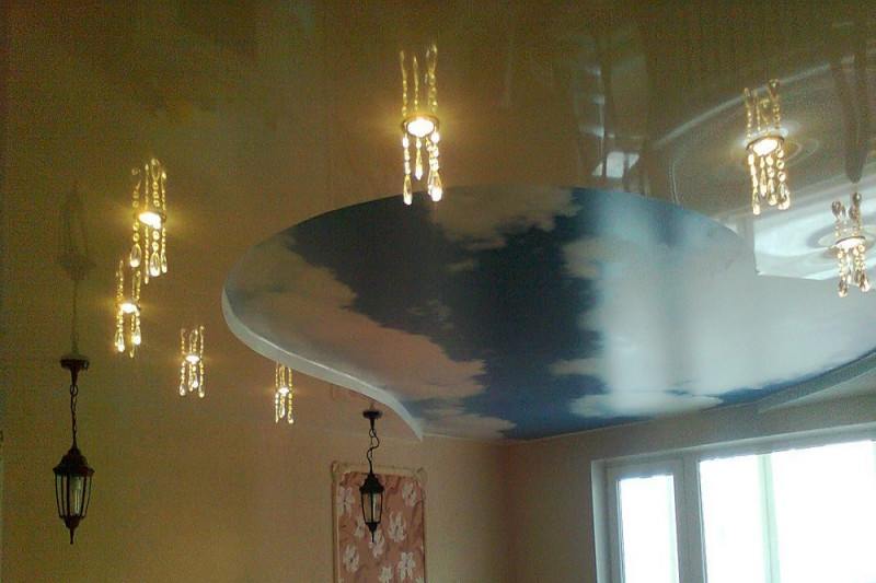 Монтаж натяжного потолка с таким дизайном возможен в комнатах с любой площадью. Это могут быть как небольшие, так и огромные залы.