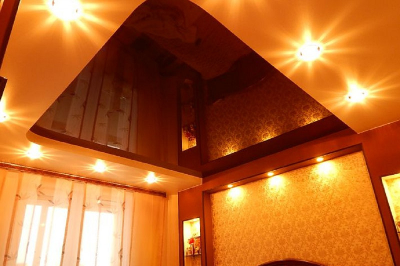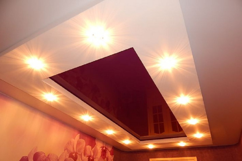 Потолок на кухне позволяет использовать подсветку. При соблюдении всех правил установки, а также норм безопасности, ее эксплуатация окажется неопасной.