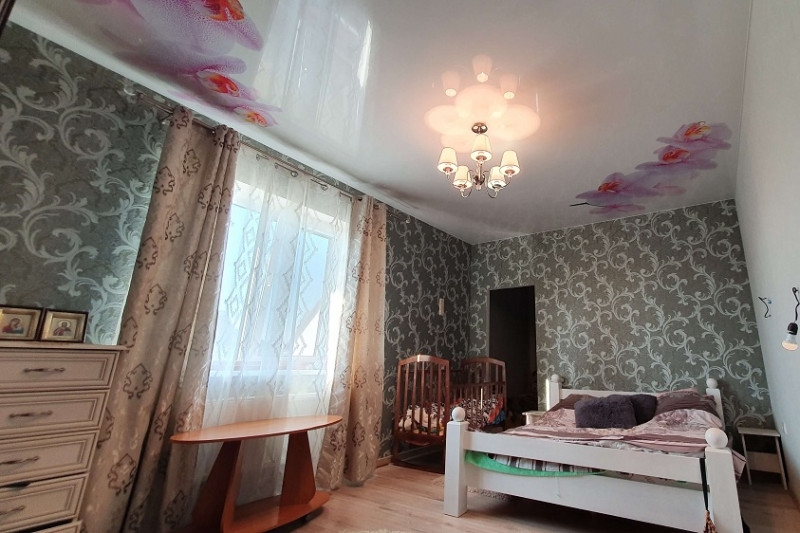 Современный натяжной потолок можно изготовить с любым подходящим дизайном. Это может быть как однотонный вариант, так и полотно с узором, рисунком или даже фотографией.