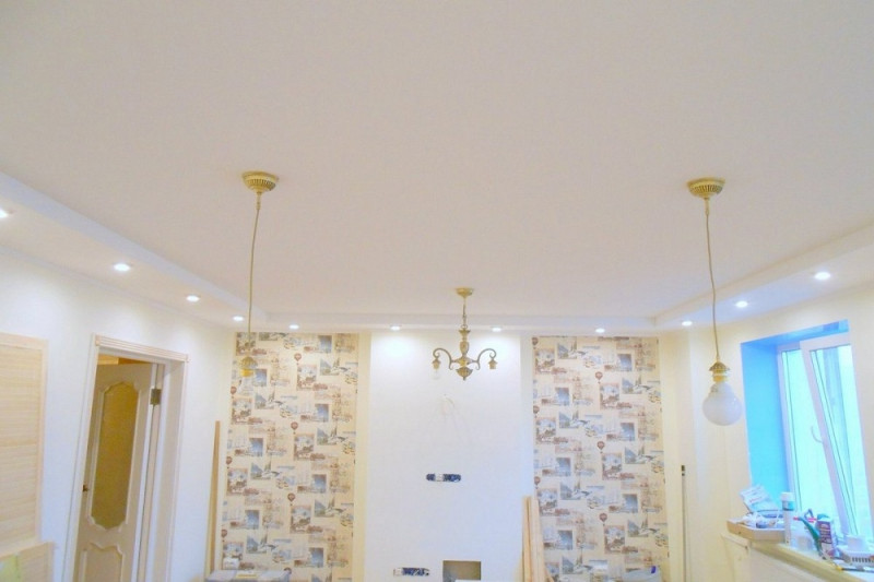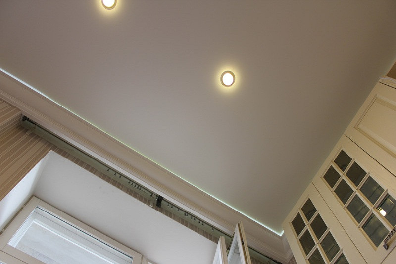 Потолок на кухне позволяет использовать подсветку. При соблюдении всех правил установки, а также норм безопасности, ее эксплуатация окажется неопасной.
